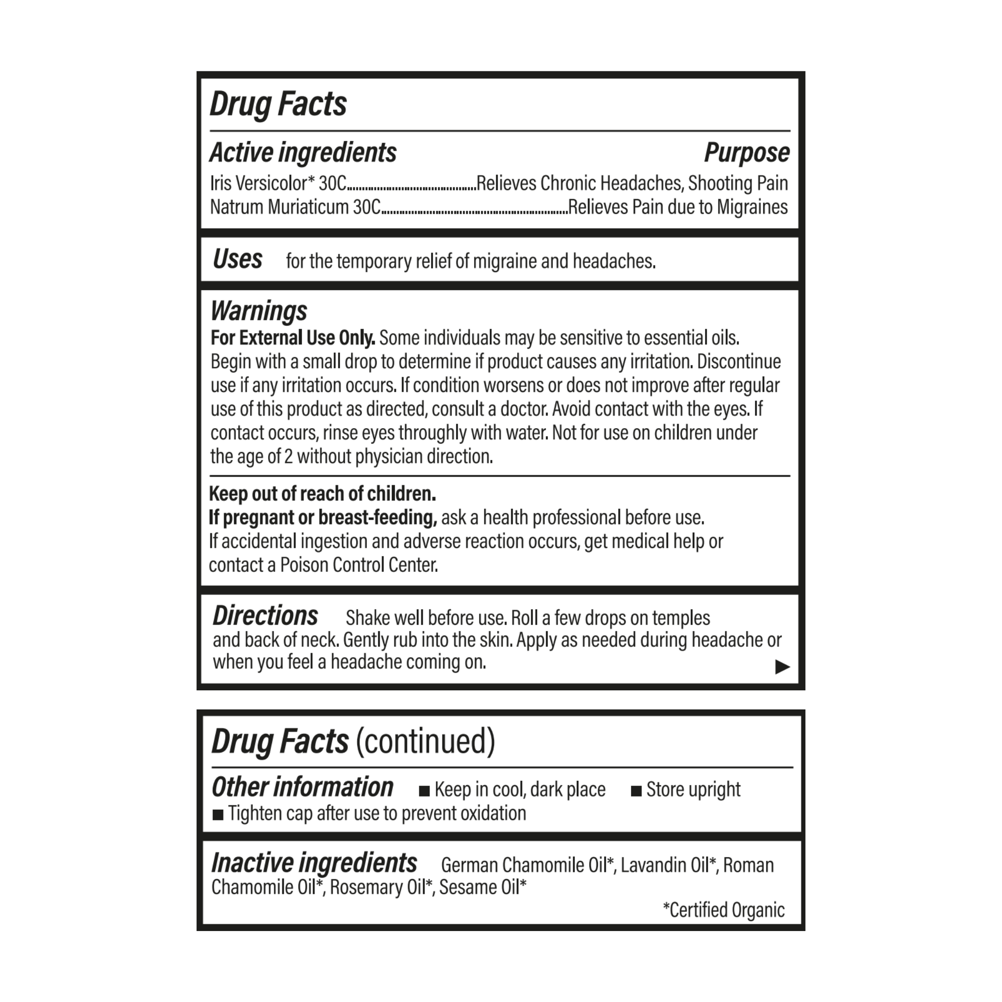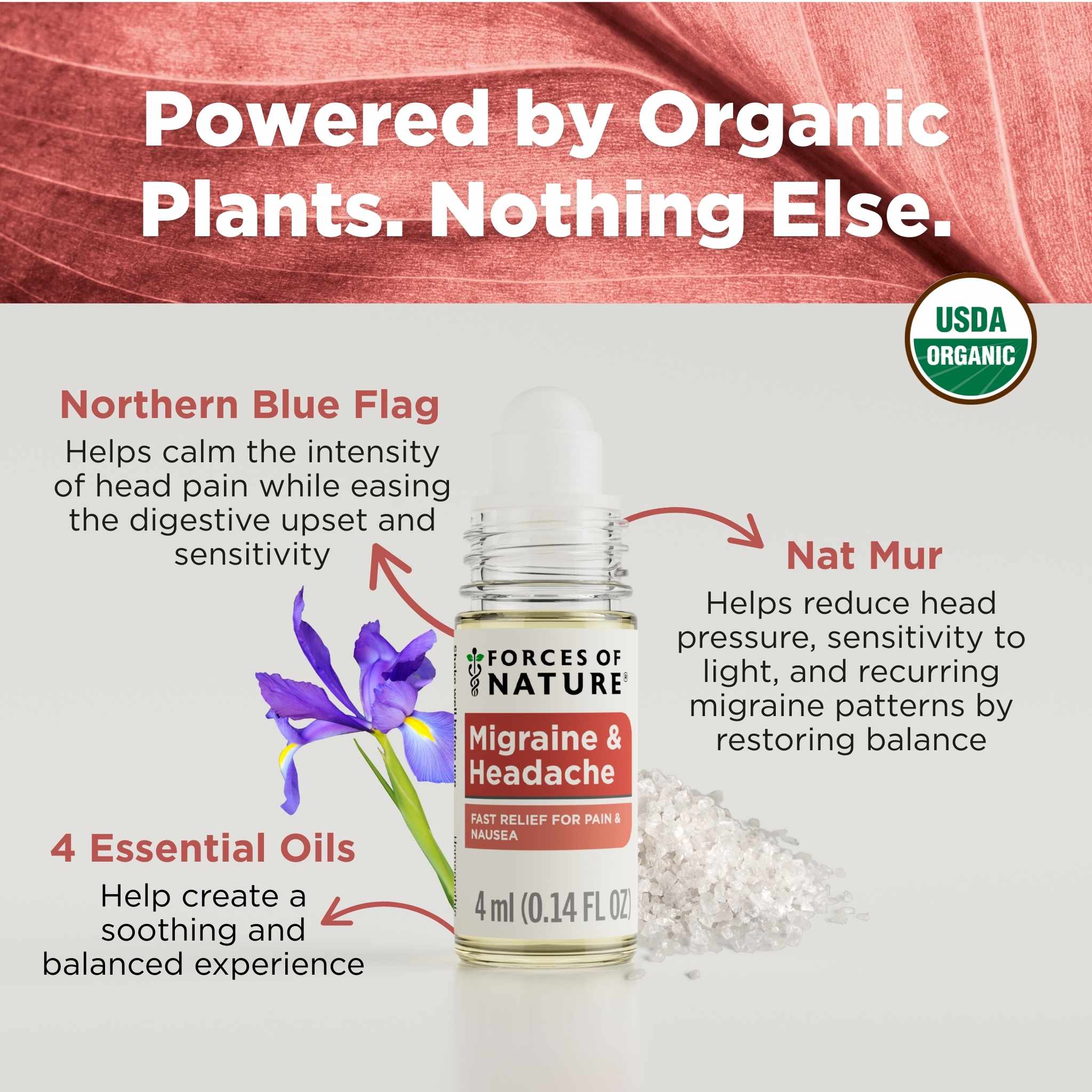 Forces of Nature Migraine is a topical. plant-based remedy design to fight migraine symptoms including throbbing. pulsing sensations. nausea. and sensitivity to light and sound. Formulated with powerful organic homeopathic actives. including Iris Versicolor (Northern Blue Flag). believed to offer relief through its anti-inflammatory and soothing effects. this roll-on oil should be massaged into temples and the back of the neck at the first signs of a migraine. The active ingredients are blended into pure essential oils. including Lavandin and Roman Chamomile. to soothe and facilitate deep absorption. Unlike common OTC migraine treatments that rely on chemicals to mask symptoms. our certified organic formula helps restore balance naturally without synthetic drugs or anything to ingest. Safe for everyday use.