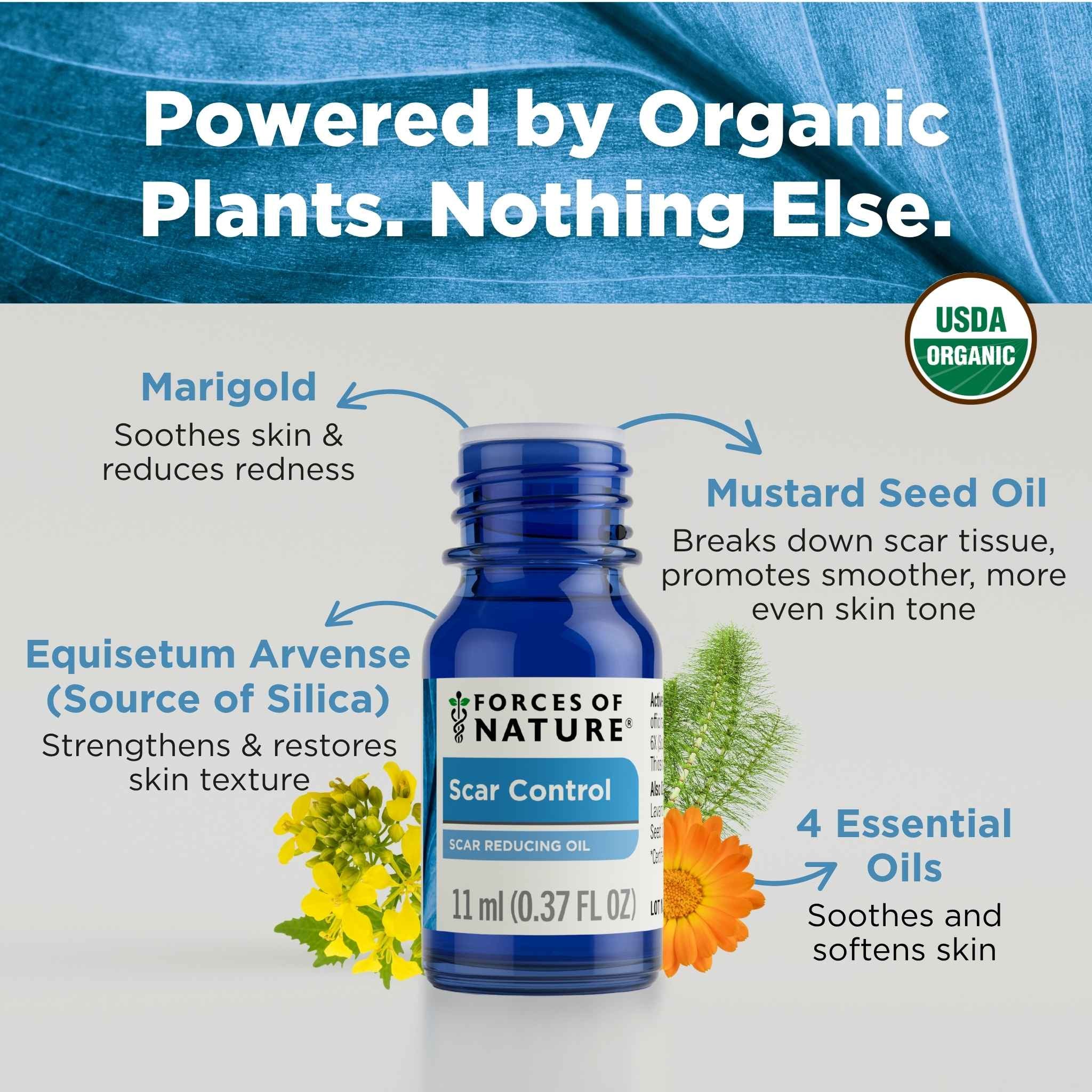 Forces of Nature Scar Control is an all-natural remedy for reducing the appearance of scars while supporting your skin’s natural healing process. Formulated with organic homeopathic medicines. including Calendula Officinalis (Marigold) for its calming properties and Thiosinaminum (Mustard Seed) traditionally used to help break down scar tissue. this plant-powered blend works to improve texture. flexibility. and even tone over time. Pure essential oils. including Helichrysum and Rosehip Seed. are blended with the homeopathic medicines to facilitate absorption and nourish damaged skin. Unlike conventional scar treatments with synthetic fillers or chemically produced ingredients. this formula is all-natural so you can feel good about what you put on your skin. Whether your scars are old or new. our fast-absorbing formula penetrates deep to promote smoother. healthier-looking skin.